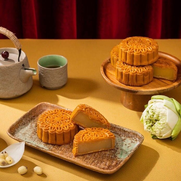 Bánh trung thu nướng nhân hạt sen là một món ăn đặc trưng của mùa thu, với lớp vỏ ngoài giòn thơm và nhân hạt sen bùi béo, mang đến hương vị thanh mát và ngọt dịu, rất phù hợp để thưởng thức vào những ngày thu se lạnh.