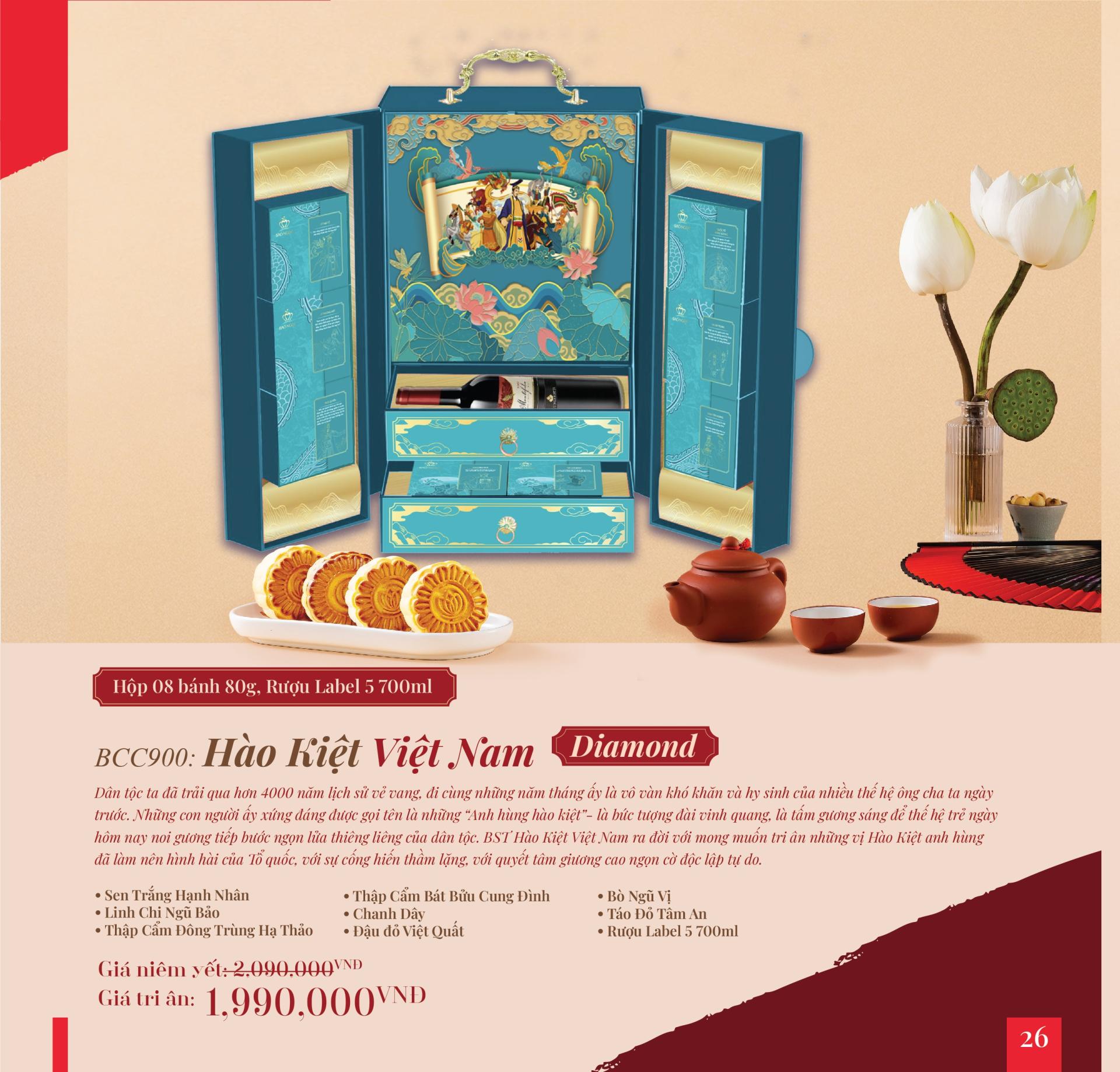 Bánh Trung Thu cao cấp “Hào Kiệt Việt Nam Diamond”: Dân tộc ta đã trải qua hơn 4000 năm lịch sử vẻ vang, đi cùng những năm tháng ấy là vô vàn khó khăn và hy sinh của nhiều thế hệ ông cha ta ngày trước. Những con người ấy xứng đáng được gọi tên là những “Anh hùng hào kiệt”- là bức tượng đài vinh quang, là tấm gương sáng để thể hệ trẻ ngày hôm nay noi gương tiếp bước ngọn lửa thiêng liêng của dân tộc. BST Hào Kiệt Việt Nam ra đời với mong muốn tri ân những vị Hào Kiệt anh hùng đã làm nên hình hài của Tổ quốc, với sự cống hiến thầm lặng, với quyết tâm giương cao ngọn cờ độc lập tự do.