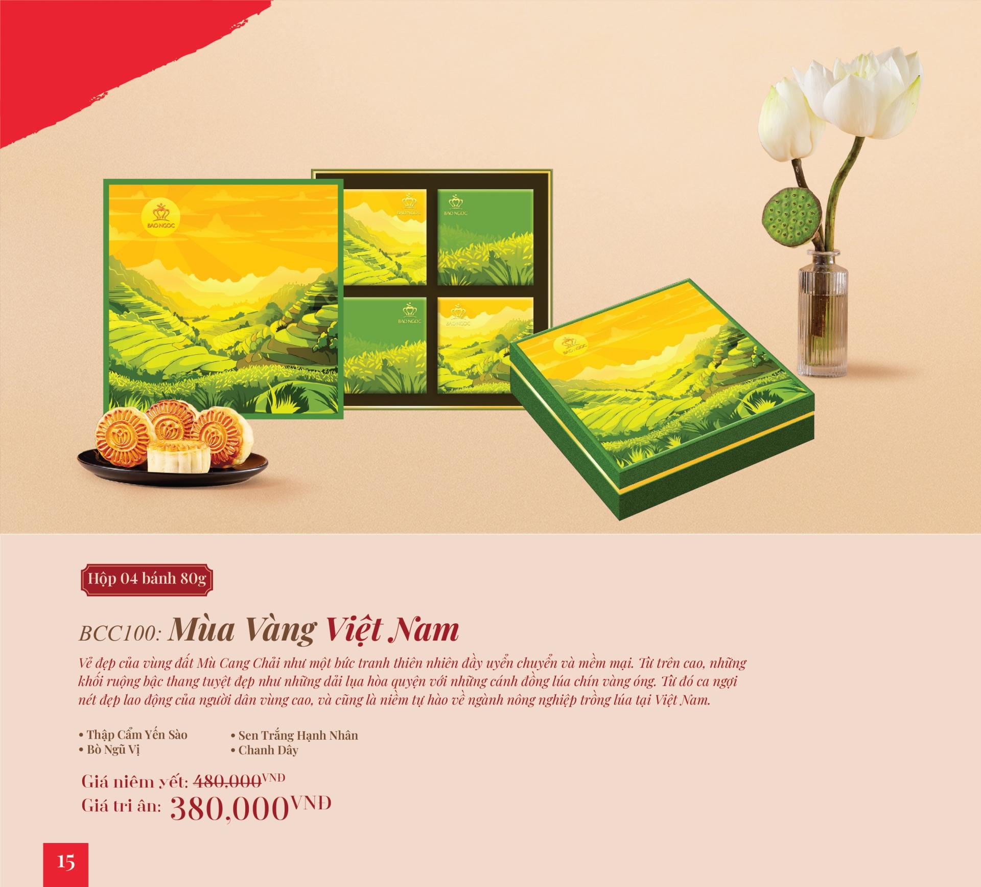 Bánh Trung Thu cao cấp “Mùa Vàng Việt Nam" mô phỏng vẻ đẹp của vùng đất Mù Cang Chải như một bức tranh thiên nhiên đầy uyển chuyển và mềm mại. Từ trên cao, những khối ruộng bậc thang tuyệt đẹp như những dải lụa hòa quyện với những cánh đồng lúa chín vàng óng. Từ đó ca ngợi nét đẹp lao động của người dân vùng cao, và cũng là niềm tự hào về ngành nông nghiệp trồng lúa tại Việt Nam.