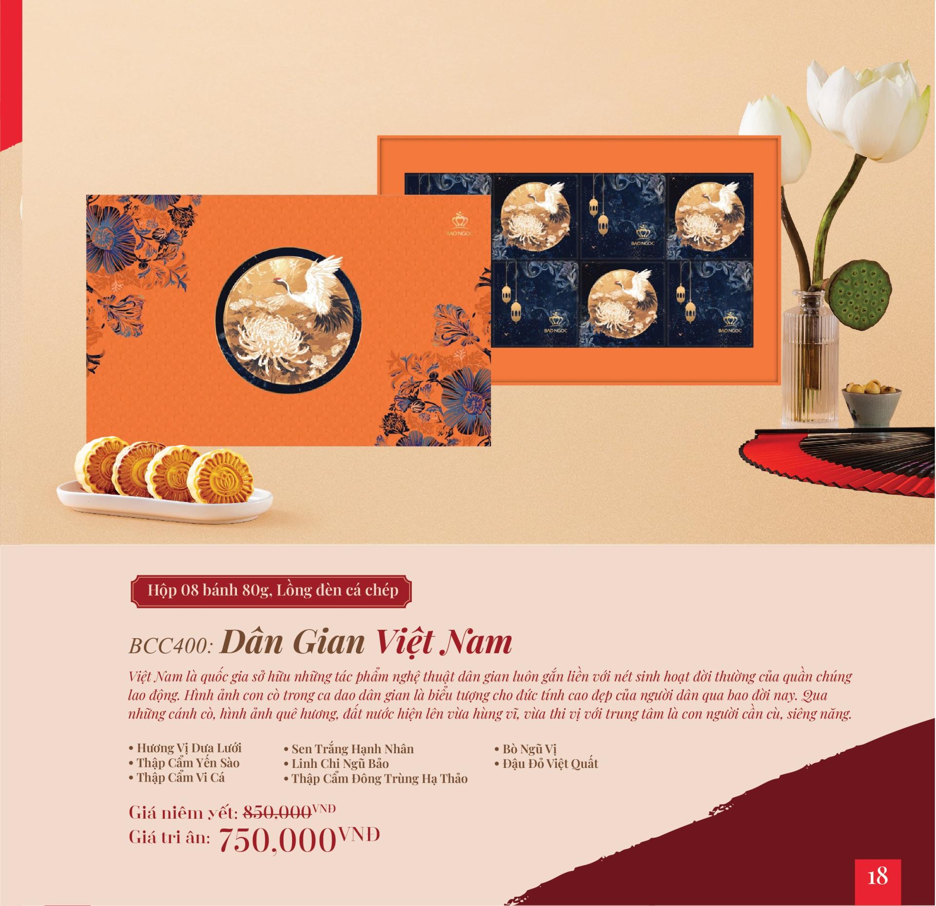 Bánh Trung Thu cao cấp “Dân Gian Việt Nam” mô phỏng nét văn hóa đặc trưng của người dân Việt Nam, nơi những tác phẩm nghệ thuật dân gian luôn gắn liền với nét sinh hoạt đời thường của quần chúng lao động. Hình ảnh con cò trong ca dao dân gian là biểu tượng cho đức tính cao đẹp của người dân qua bao đời nay. Qua những cánh cò, hình ảnh quê hương, đất nước hiện lên vừa hùng vĩ, vừa thi vị với trung tâm là con người cần cù, siêng năng.